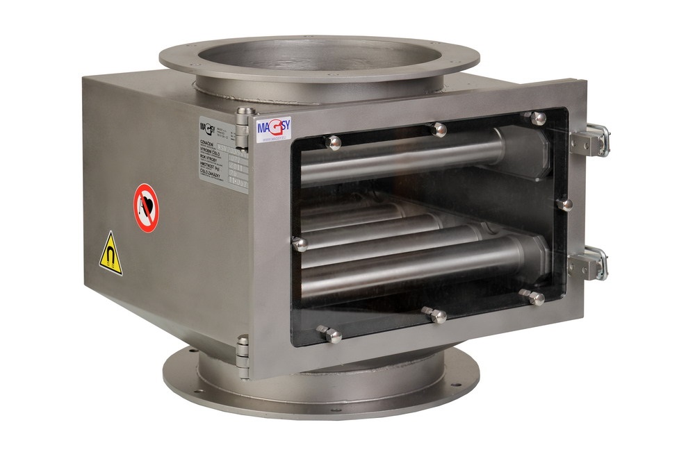 “MSV” magnetic separator is a grate-type separator situated in a case, with a manual grate cleaning. It is the most common separator type used in a separation of magnetic impurities from dry mixtures characterized by good loose parameters, transported within industrial pipe systems in discontinuous operations.